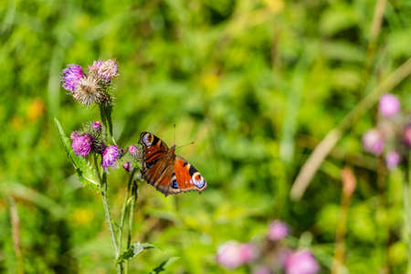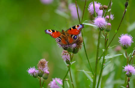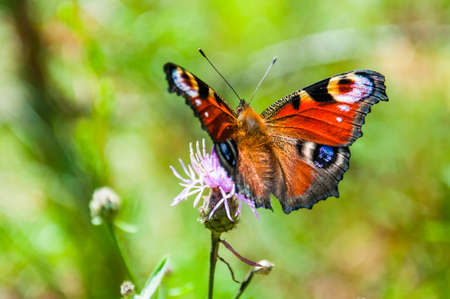 Colorful natural background with a Peacock butterfly on a flower. Limited depth of field.