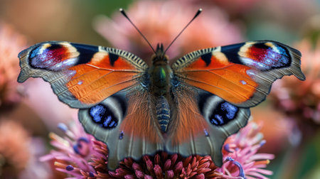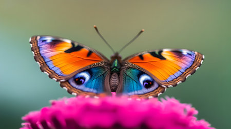 AI-generated A vibrant peacock butterfly rests on a bright pink flower, showcasing its intricate wing patterns. The macro shot captures the delicate beauty of nature.