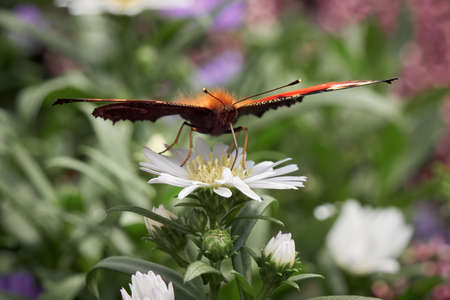 Close up of orange, red butterfly that is standing with widespread wings on the bush of white flower of chrysanthemums.