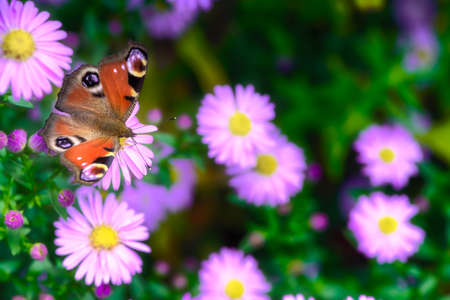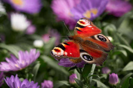 A bright peacock butterfly with spread wings of red-orange-black-white-lilac color sits on purple Symphyotrichum novi-belgii flowers on a sunny autumn day. Horizontal.