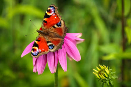 Beautiful colored European Peacock butterfly, Inachis io, Aglais io, on purple flower Echinacea in a sunny summer garden.