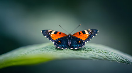 A beautiful orange and black butterfly rests with its wings spread wide on a textured green leaf. The shallow depth of field highlights the intricate details of the insect.