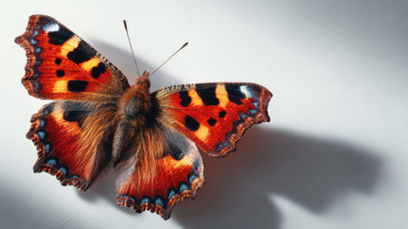Vibrant butterfly with detailed wings, showcasing a beautiful combination of orange, red, and black markings. The butterfly's wings are spread and display a intricate pattern. Its delicate texture is clearly visible. The image is a close-up, highlighting the textures and intricate patterns.