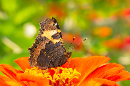 Close-up photo of butterfly Aglais urticae which drinks nectar from a red flower
