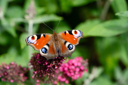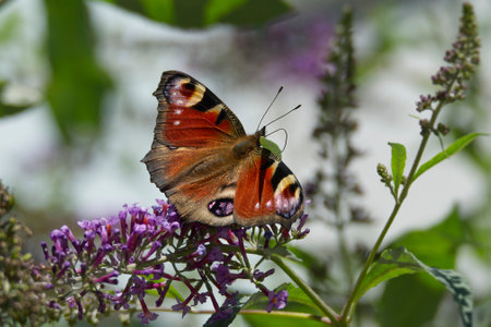 European peacock butterfly (Aglais io) perched on summer lilac in Zurich, Switzerland