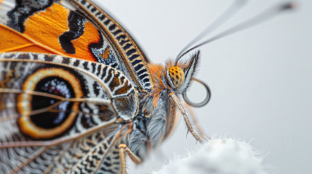 A stunning display of natures intricate details. Close-up of a butterfly wing against pink flowers. The vibrant orange and brown tones contrast beautifully with the delicate purple petals.