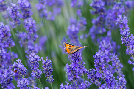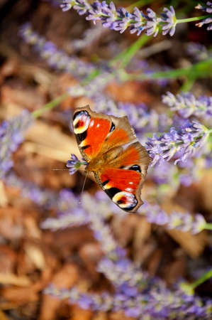 Beautiful Aglais io butterfly on a lavender flower. Closeup shot