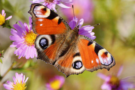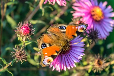 Aglais io or European peacock colorful butterfly sitting on violet purple blooming flower. This vibrant butterfly found in Europe and temperate Asia, the only member of the genus Inachis