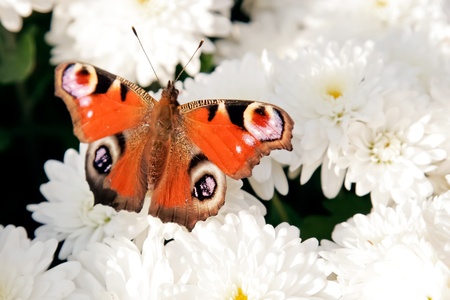 One-day peacock butterfly on white flowers