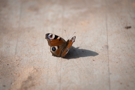 Close up of a butterfly that lay at the wooden plank. Selective focus at the butterfly under the sunlight.