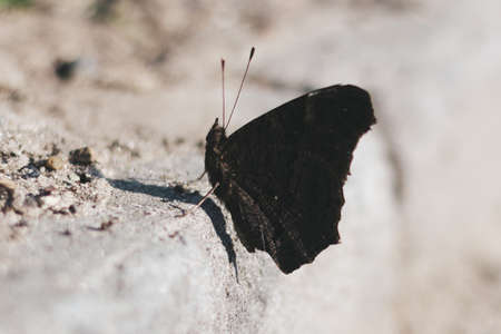 A butterfly with spread wings sits on the ground. Close view. Sunny day.