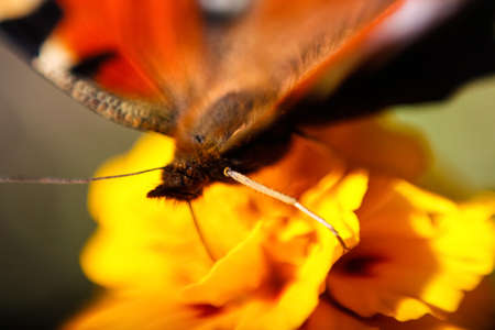 Defocus slowpoke butterfly peacock collecting pollen on a bright yellow flower side view. Macro. Extreme close-up photography. Face butterfly with antenna. Out of focus
