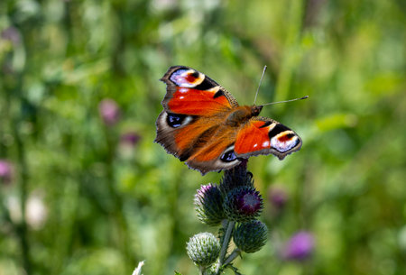 Close up of a peacock butterfly in a flower meadow on a sunny day
