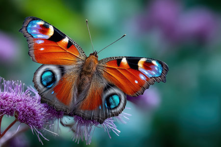 Peacock butterfly sitting on purple flower