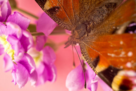 macro Photo of Peacock Butterfly on single pastel flower.