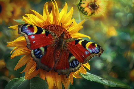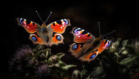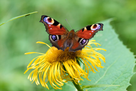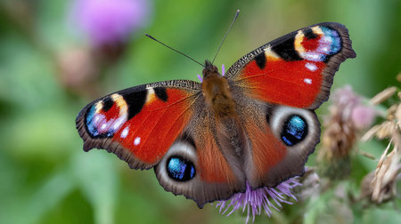 A breathtaking closeup of a vibrant Peacock butterfly proudly displaying its stunning vivid colors among lush greenery