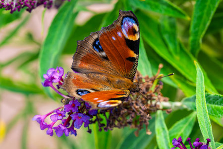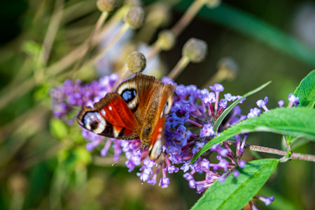 Aglais io, peacock butterfly, feeding nectar from a purple butterfly-bush in garden. Bright sunlight, vibrant colors.