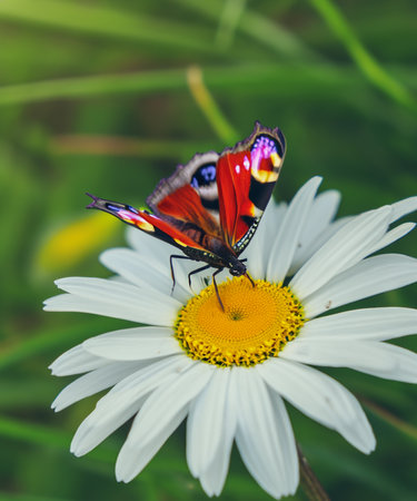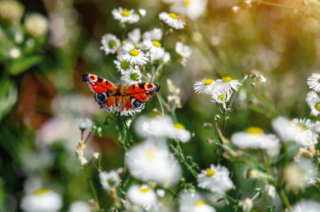 Red admiral butterfly with bright wings on white daisy amid floral blurred backdrop
