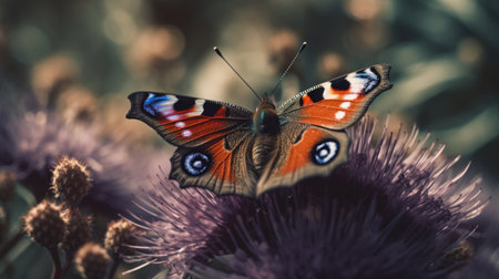 A closeup shot of a peacock's eye butterfly on a thistle flower