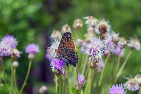 butterfly pollinating a flower. wildlife. colorful detailed macro photo of an insect. close-up. space for text. screensaver. bokeh. butterfly. Aglais io. Nymphalidae.