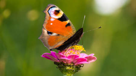 European peacock butterfly (Aglais io) sitting on pink flower in Zurich, Switzerland