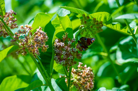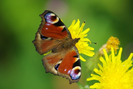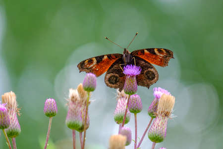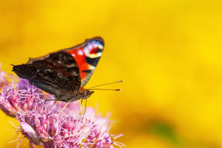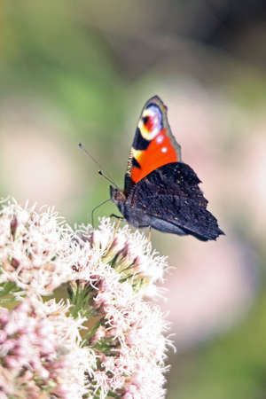 The butterfly Peacock eye (lat. Aglais io) collects nectar from flowers.