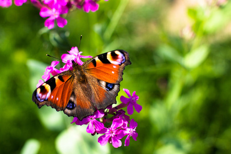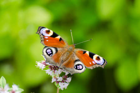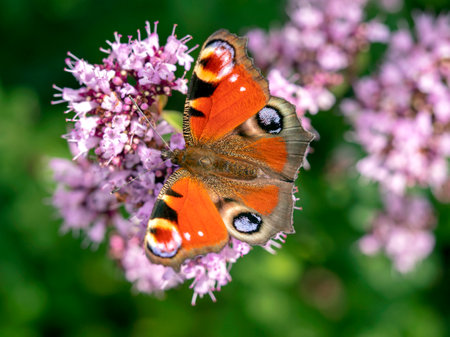 peacock eye butterfly sucks nectar on thyme, sunny day, summer time