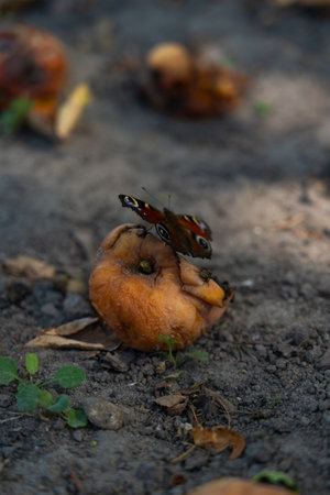 A butterfly sits on an apple. Autumn in the village, dry foliage