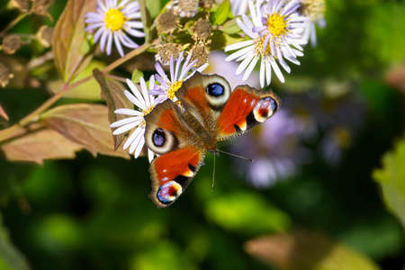 European butterfly Peacock Aglais io on the flower Aster Amelus