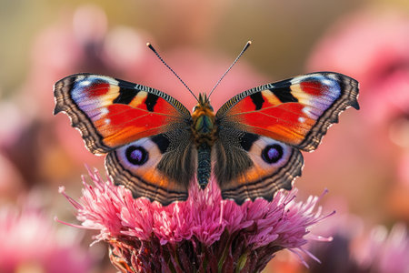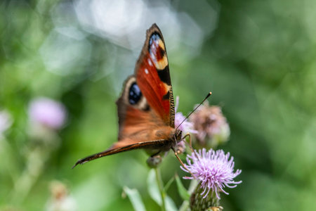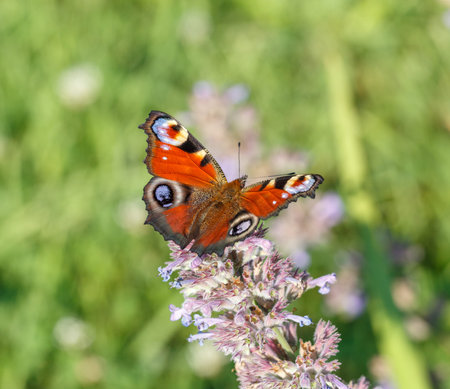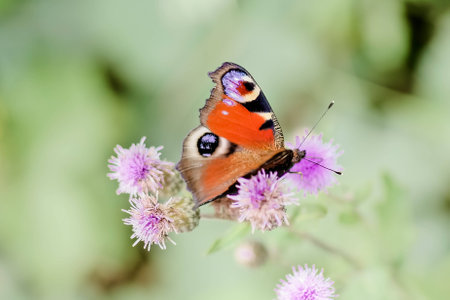 A Colorful Butterfly, Aglais io, Syn.: Inachis io, Nymphalis io, Sitting Gracefully on a Beautiful Flower in the Splendor of Nature