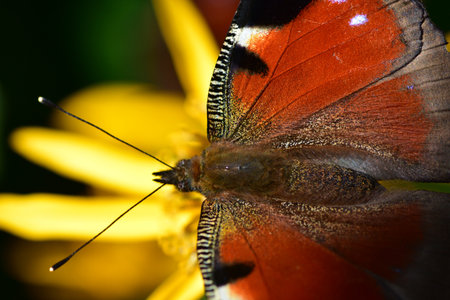 Defocus slowpoke butterfly peacock collecting pollen on a bright yellow flower side view. Macro. Extreme close-up photography. Face butterfly with antenna. Out of focus