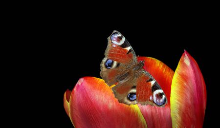 bright colorful peacock butterfly on a flower. butterfly sitting on a tulip. copy space