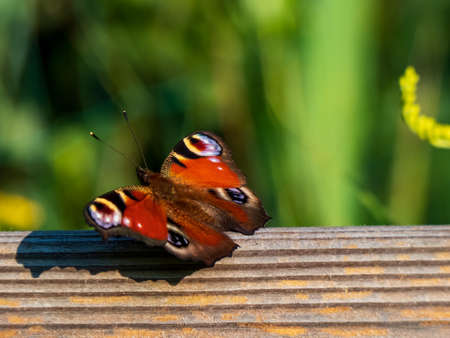 Macro shot of beautiful colourful butterfly - European peacock or peacock butterfly (Aglais io) on the wooden board with blurred green background. Wings are rusty red, wingtip is black, blue and yellow