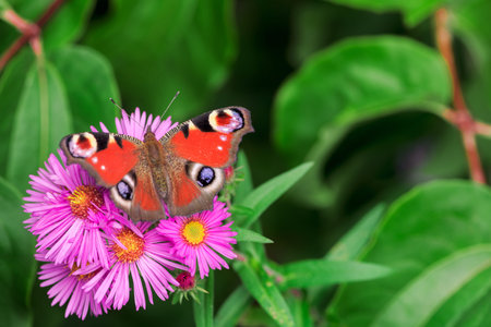 Peacock butterfly (Inachis io) on autumn asters flowers