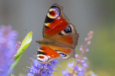 Peacock butterfly sitting on blue flower, in latin Inachis Io or Aglais Io