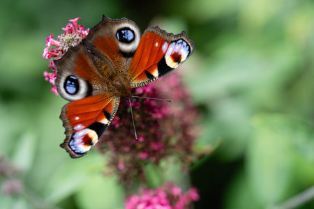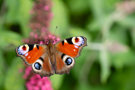 Peacock butterfly, butterfly on a flower. Butterfly bush with pink flowers. Insect photo on a flower