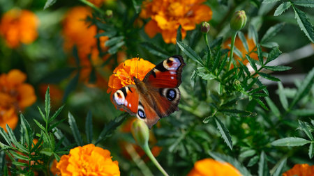 A peacock butterfly (aglais io) sitting on a marigold flower. Close up.