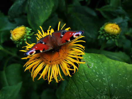 Butterfly Peacock Eye sits on a yellow rudbeckia flower