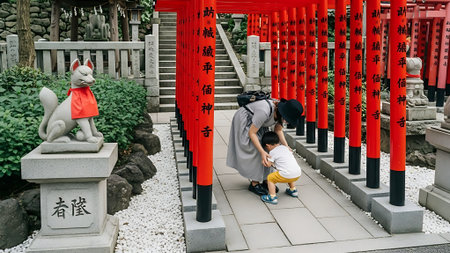 Serene moment captured at a Shinto shrine with a woman and child amidst red torii gates and a stone fox statue.