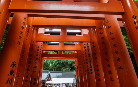 Japan - July 15, 2019 : Hundreds of Torii Gate Tunnel carving with the name of donators at Fushimi Inari Shrine, Fushimi, Kyoto