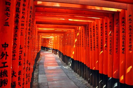 Kyoto, Japan - December 27, 2009: Orange wooden torii tunnel in Fushimi Inari Taisha Shrine. It is one of the most famous place for tourist.