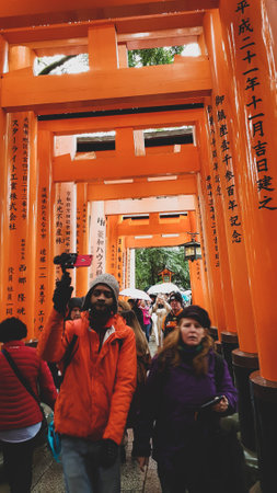 Kyoto, Japan in April 2019. Tourists taking pictures and walking in the Fushimi Inari area of Kyoto. Fushimi Inari Taisha is a Shinto shrine located in Fushimi-ku, Kyoto, Japan. It is the central shrine for about 40,000 Inari shrines that venerate Inari.