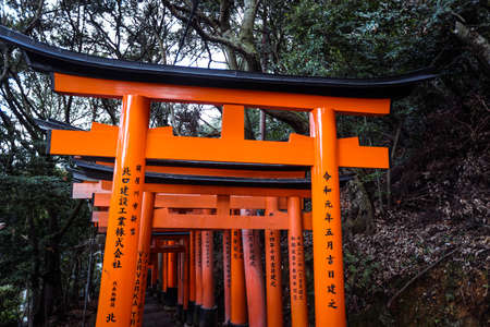 Kyoto - May 28, 2019: Torii gates of the Fushimi Inari Shinto shrine in Kyoto, Japan