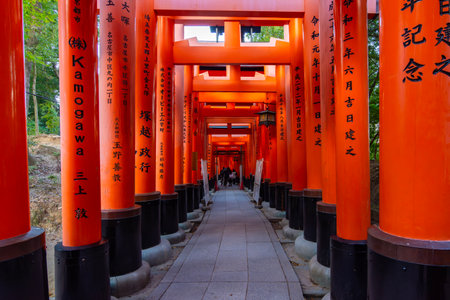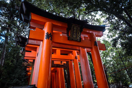 Kyoto, Japan - September 25 2018: Red Torii gates in Fushimi Inari Shrine in Kyoto, Japan. It is the famous landmark and tourist travel destination of Kyoto.