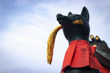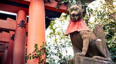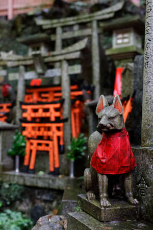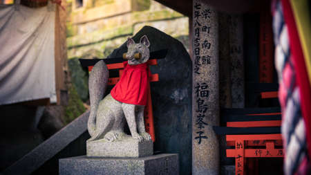 Kitsune japanese fox statue with red apron at famous Fushimi Inari-Taisha shrine near Kyoto. Japan god guard made of stone at Shinto shrine