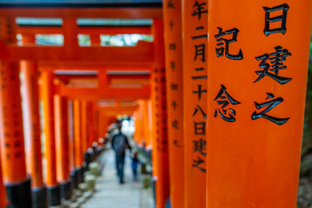 Kyoto, Japan - March 24, 2017: unrecognizable people walking under tori gates and close-up of Japanese writing at the Fushimi Inari Shrine, taken on a sunny spring afternoon