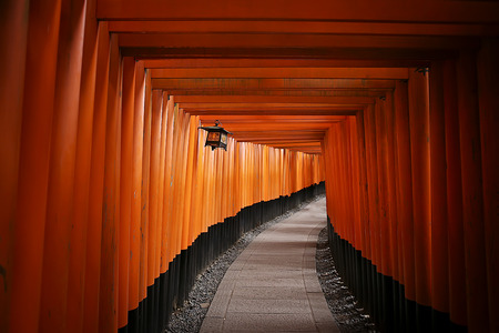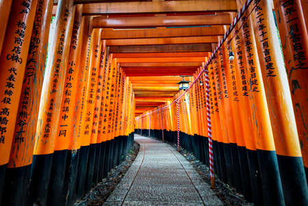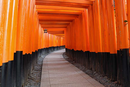 CurvebFootpath corridor decoration with Many Red wooden Tori Gates of Fushimi Inari Shrine in Kyoto, Japan. Lord, open 24 hr. 7 days, is one of the most famous travel destinations in Kyoto.