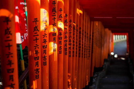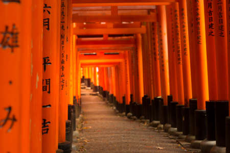 Red Tori Gate at Fushimi Inari Shrine in Kyoto, Japan , selective focus with soft focus
