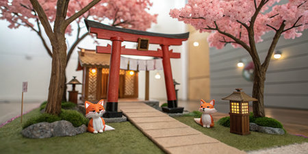 A detailed miniature diorama depicts a Japanese shrine with two fox figurines. Pink cherry blossoms frame the scene. The shrine is illuminated, creating a warm atmosphere. The foxes appear calm and serene. The background is a blurred, light-colored wall, possibly suggesting an indoor setting. The overall mood is peaceful and tranquil.