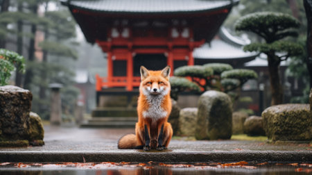 a big red fox, in the style of japanese photography, sits in front of a pagoda in the rain. this epic portraiture captures the intense gaze of the fox, merging the essence of nature and cabincore aesthetics. a stunning image that embodies environmentalism and can be found on furaffinity. ai generated